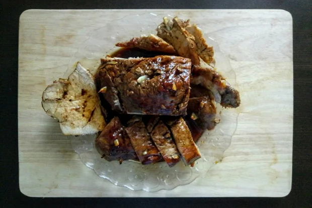 ШАГ 3 Подготовленную свинину выложить на противень, выстеленный фольгой и полить соусом.