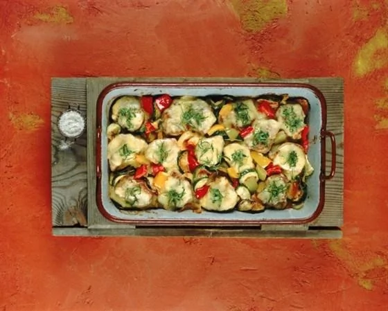 ШАГ 3 Получившуюся смесь посолите и поперчите по вкусу. Выложите кабачки в форму для запекания, залейте их овощной смесью и потомите в духовке еще 15–20 минут. Готовое блюдо охладите и подавайте, посыпав рубленой зеленью.
