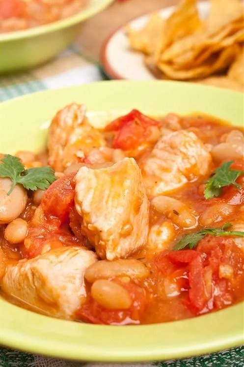 ШАГ 3 Добавьте консервированные томаты, фасоль, специи, петрушку. Тушите 20 минут. Полейте курицу и подавайте.