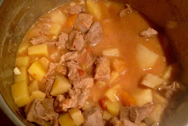 ШАГ 5 Смешать компот с соевым соусом и влить в кастрюлю. Накрыть крышкой и тушить на среднем огне 20 минут.
