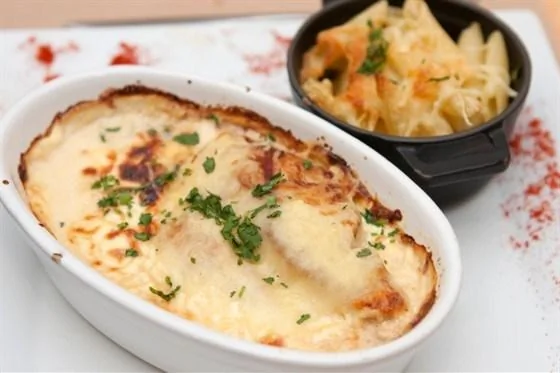 ШАГ 2 Сделайте белый соус, смешав масло, муку, молоко, куриный бульон, сливки и специи. Добавьте курицу и сухой шерри.