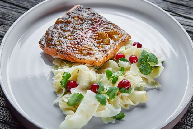 ШАГ 3 Как только рыба начнет белеть внутри в срезе, ее можно подавать. Рыбу подавать с сельдереем, предварительно замешанным с кинзой и клюквой.