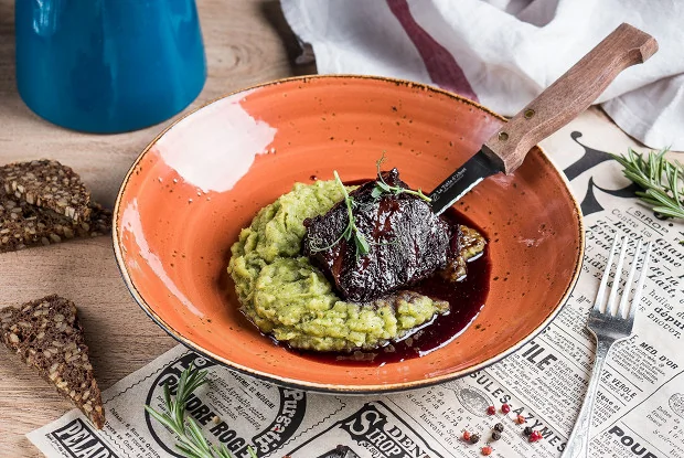 ШАГ 3 При подаче на тарелку выложить картофельное пюре, рядом щеки и полить оставшимся соусом.
