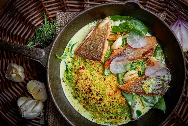 ШАГ 3 Быстро обжарить рыбные стейки на сковороде. В отдельную сковороду выложить отварной булгур, шпинат, на шпинат выложить жареный с 2 сторон маленькие кусочки лосося, залить соусом.