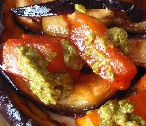 ШАГ 2 Выкладываем тыкву и баклажаны в огнеупорное блюдо и поливаем выделившимся соком, перемешанным с маринадом.