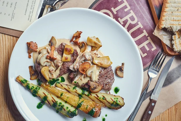 ШАГ 4 Выложить на тарелку дольки пастернака, полить их соусом Песто, рядом положить мясо.