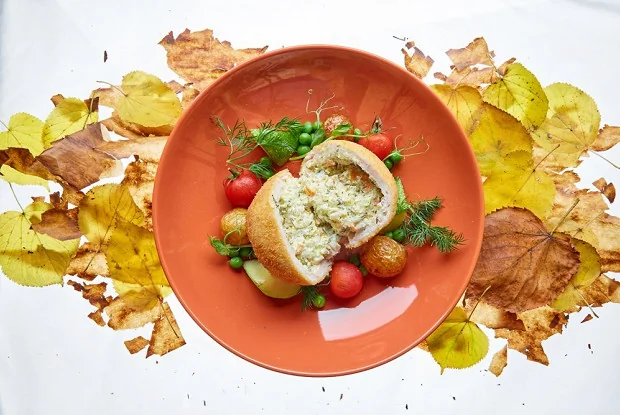 ШАГ 2 Отдельно тонко отбить куриное филе. В центр куска положить начинку и сформировать шар. Запанировать в муке, затем обвалять в яйце и панировочных сухарях. Опустить полученный шар во фритюр до образования золотистой корочки. После поставить в духовой шкаф на 10 минут при температуре 180 градусов.