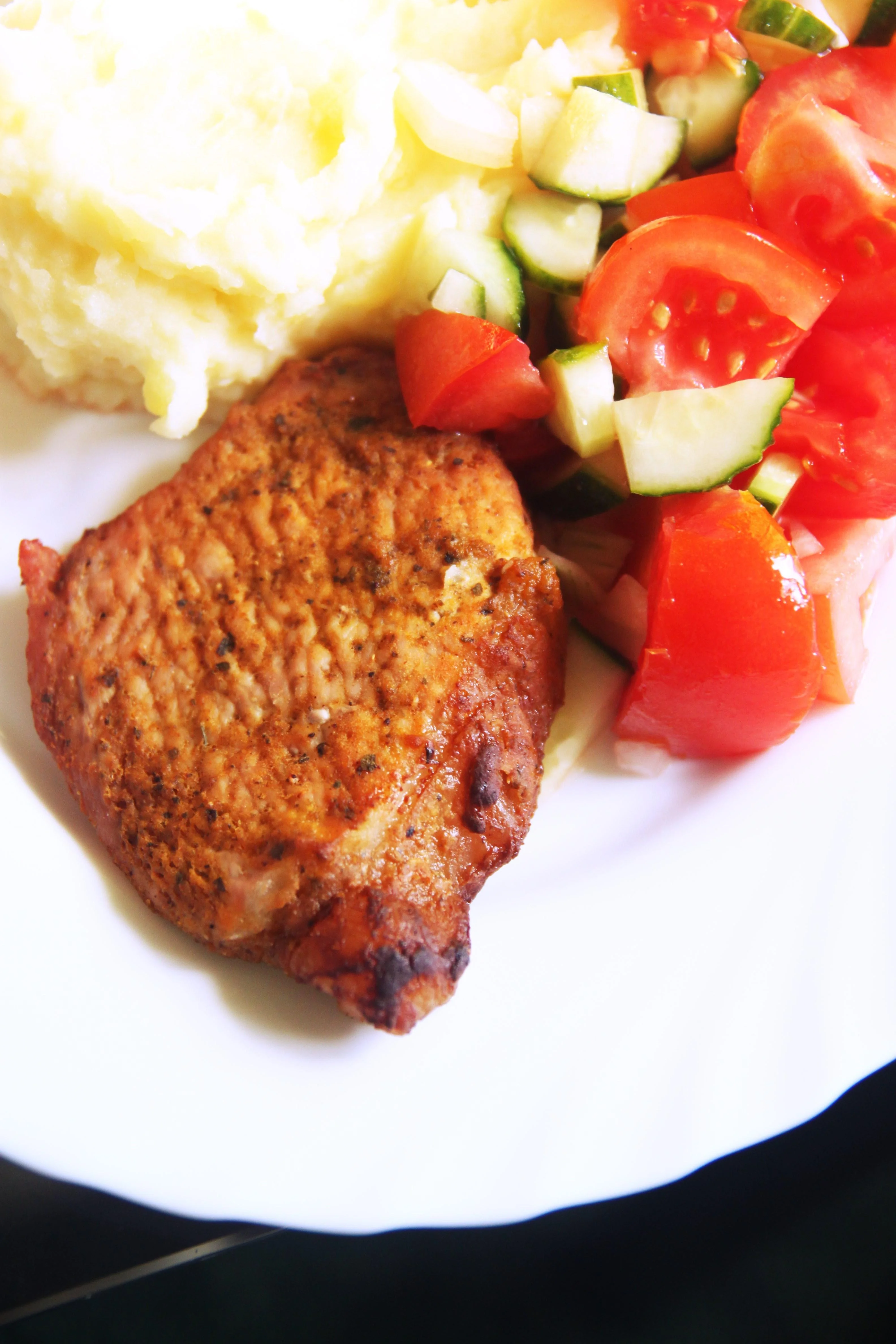 ШАГ 4 Смазать кусочки свинины горчичной смесью с обеих сторон. Выложить их на противень или в огнеупорную сковородку. Прикрыть сверху бумагой для запекания. Отправить в духовку.
