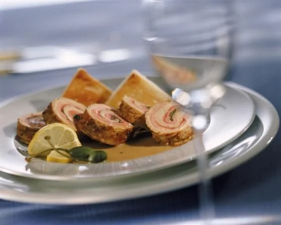 ШАГ 4 В середину рулета класть ложкой смесь, сворачивать рулеты, скреплять шпажками.