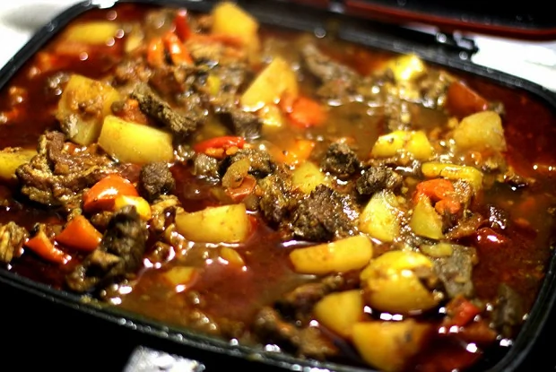 Говядина Бекон Репчатый лук Паприка Картофель Красный сладкий перец Помидоры Морковь Чеснок Соль Зеленый перец Тмин Петрушка Листья кинзы (кориандра) главная Основные блюда
