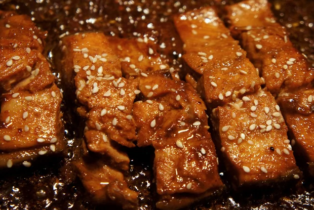 ШАГ 4 Разогреваем сковороду, смазываем сливочным маслом. Выливаем маринад на сковороду, подогреваем, выкладываем рыбу и обжариваем с двух сторон, посыпаем кунжутными семечками.