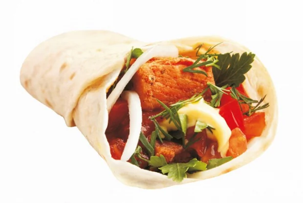 ШАГ 7 Подавайте шашлык, выложив на лаваш вместе с овощами и зеленью и полив томатным соусом.