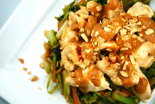 Добавьте к курице арахисовое масло, соевый соус и соус чили, цедру и сок лайма. Хорошо перемешайте. При необходимости соус можно разбавить небольшим количеством теплой воды.