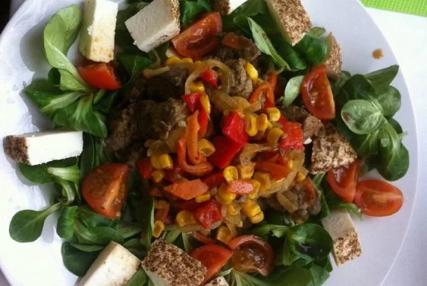 ШАГ 4 На салат корн выложить печень с овощами, добавить помидоры черри и адыгейский сыр.