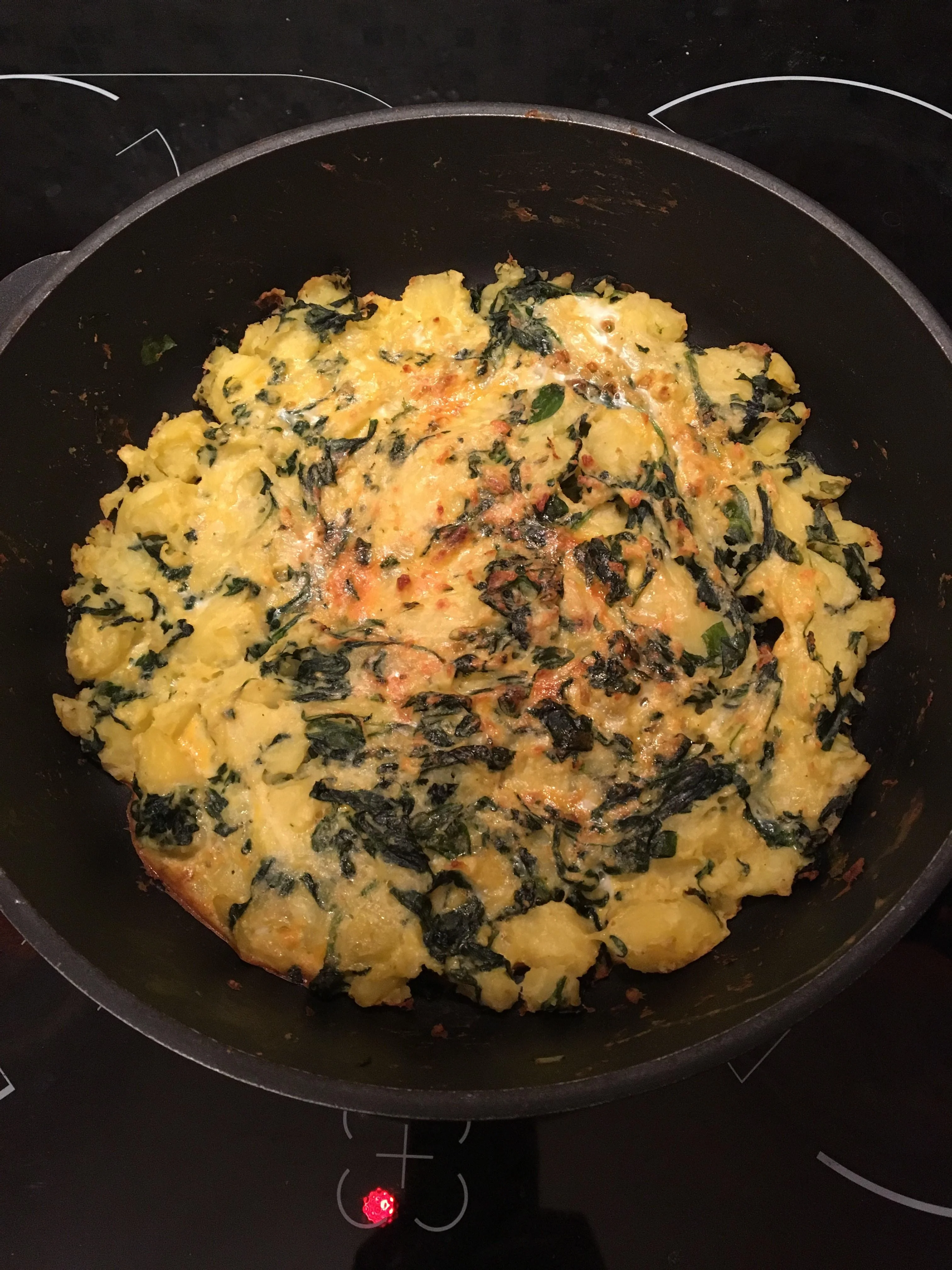 ШАГ 3 Как только чеснок начнет благоухать, нужно бросить в сковороду листья шпината и, помешивая, добиться того, чтобы они сникли, как будто вся жизненная сила ушла из зелени в соус. Тогда нужно посолить и поперчить содержимое сковородки. И смешать его с картошкой и сметаной при помощи большой вилки.