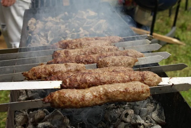ШАГ 7 Из фарша сформировать колбаски весом 100-150 г и налепить их на шампуры. Если фарш сильно прилипает к рукам, смачивать руки водой.