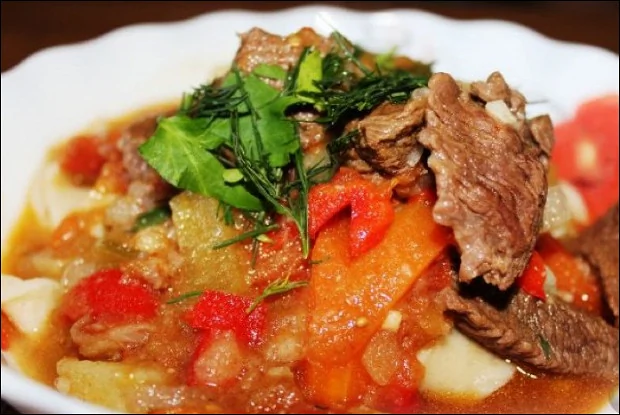 ШАГ 10 Тушить говядину с овощами 50 минут, за 5 минут до готовности бросить нарезанный чеснок.