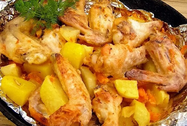 Куриные крылья с овощами в духовке