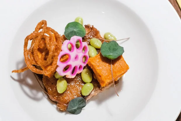 ШАГ 9 Выложить котлету на тарелку, поместить сверху кубики копченого пюре из батата, эдамаме, ломтик корня лотоса, 2-3 листика настурции и кольца лука-фри.