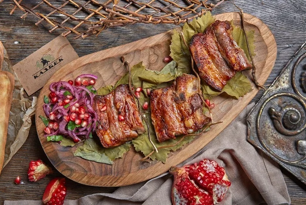 ШАГ 5 Шашлык подавать с маринованным луком и зернами граната.