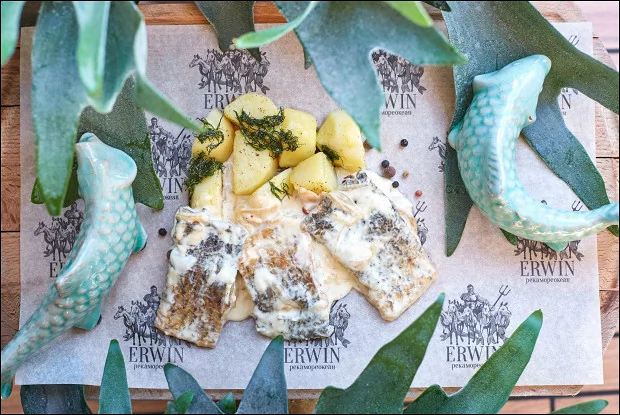ШАГ 4 Обжарить на растительном масле карасей, добавить лук репчатый, залить сливками и томить несколько минут, посолить и в конце добавить сметану. Выложить на тарелку рыбу, полить сверху соусом и украсить веточками укропа.