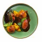 ШАГ 8 Утку нарезать ломтиками. На тарелку выложить морковное пюре в форме кнели, затем ломтики утки, поперчить их, добавить мушмулу, обжаренную черемшу, полить демиглясом и выпаренным морковным соком.