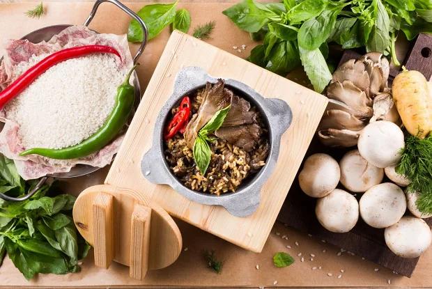 ШАГ 4 После добавить 20 мл трюфельного масла и сливочное масло, накрыть крышкой и томить 10-15 минут. Готовый плов перемешать и остудить.