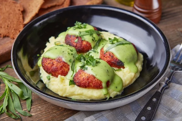 ШАГ 6 На тарелку выложить картофельное пюре, рядом фиш-боллы и полить сверху соусом.