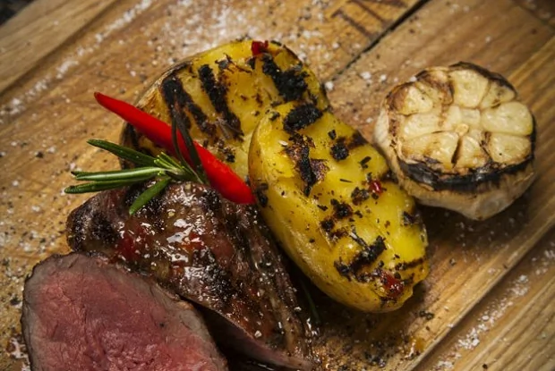 ШАГ 5 Перед подачей стейк посолить, приправить перцем, украсить розмарином и перцем чили, гарнировать печеным картофелем.