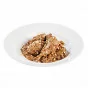 ШАГ 2 В толстостенной кастрюле слегка обжарить хлеб и чеснок на оливковом масле, затем вынуть их, а в кастрюле обжарить курицу до золотистой корочки. Обжаренную курицу переложить в любую другую посуду.