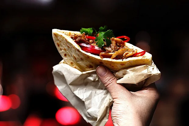 ШАГ 3 Питу разрезать пополам, промазать соусом, выложить начинку внутрь, запекать ее в пите полторы минуты.