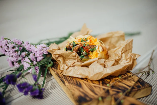 ШАГ 4 Питу подогреть на сухой сковороде, срезать пару сантиметров, чтобы можно было открыть карман. Туда поместить 100 гр хумуса, немного салата и 3 котлеты.
