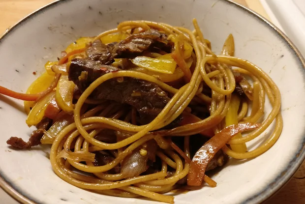 ШАГ 1 Мясо (на самом деле можно использовать и курицу, и свинину) нарезаем на тонкие кусочки. В сковородку наливаем оливыч, разогреваем сковородку до тех пор, пока масло не начало дымить. Выкладываем мясо, обжариваем на большом огне буквально несколько минут (если куски действительно тонкие, то этого хватит).