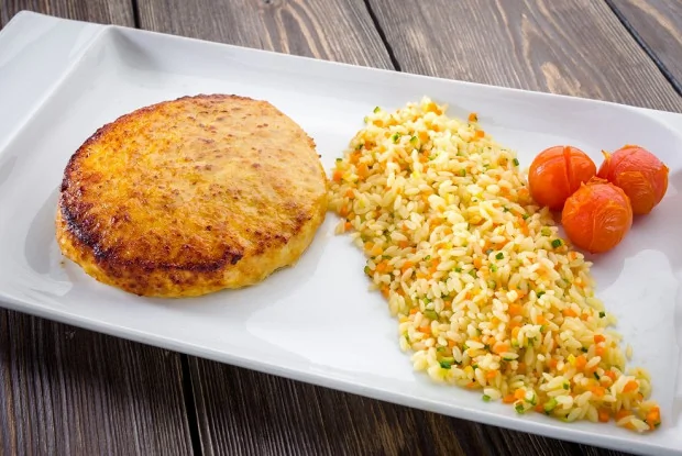 ШАГ 11 Выложить на тарелку куриную котлету, рядом положить гарнир из пасты с овощами, запеченный помидор с веточкой базилика.