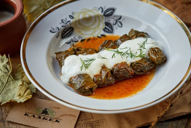 ШАГ 5 Виноградные листья обдать кипятком и завернуть в них фарш.