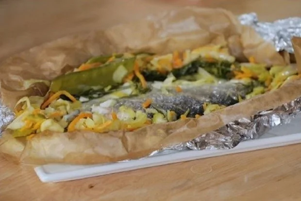 ШАГ 2 Противень застелить фольгой, а сверху пергаментной бумагой. Перемешать готовые овощи, посолить, поперчить и сбрызнуть оливковым маслом. Можно добавить прованские травы. Затем выложить овощи на бумагу, а сверху положить рыбу. Добавить немного укропа и выложить остальные овощи поверх рыбы. Добавить кусочек сливочного масла и завернуть все это в фольгу, чтобы не было зазоров.