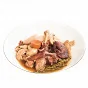 ШАГ 6 Добавить измельченный чеснок, крупно нарезанные шалот и грибы, веточки тимьяна, лавровый лист, бульон и мясо. Накрыть крышкой и тушить на низком огне 30 минут. Затем перевернуть мясо и тушить еще 15 минут. Готовое блюдо посыпать рубленой петрушкой.