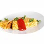 ШАГ 4 Когда внизу омлет уже приготовился, а на поверхности еще остается сыроватым, выключить огонь и выложить на омлет половину жареного риса. Сложить края омлета на рис как бы заворачивая начинку в омлет. Аккуратно переложить омлет с рисом на тарелку, перевернув сковороду. Подавать с кетчупом, украсив петрушкой.