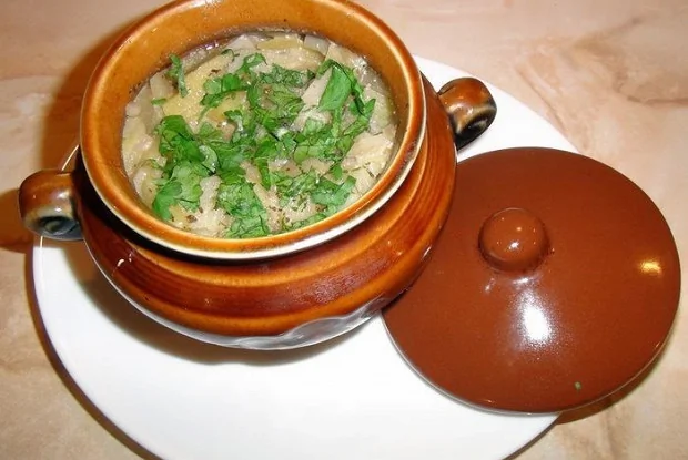 ШАГ 7 Посолить, поперчить, положить лавровый лист и тмин, накрыть крышкой и поставить горшок в заранее разогретую до 160°С духовку на 1 час.