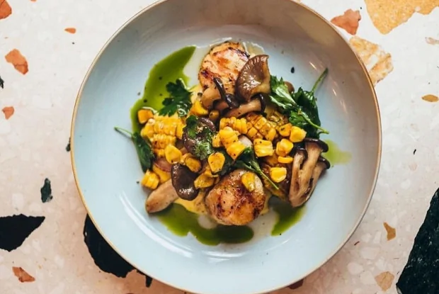 ШАГ 6 Обжарить мелко нарезанные грибы (вешенки, шампиньоны) на раскаленной сковороде на сливочном масле, посолить, добавить кукурузу с гриля, листья петрушки и выложить сверху на гребешки с кремом. Добавить оливковое масло с петрушкой и чесноком.