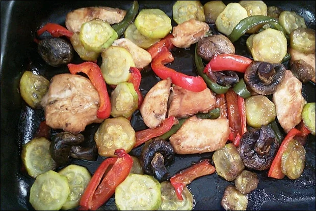 ШАГ 5 Разложить овощи и мясо без соуса в смазанную маслом форму и запекать в духовке в течение 30 минут при 180–200 градусах.