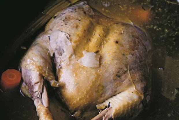 ШАГ 8 Достать курицу из кастрюли и дать остыть 2–3 минуты. Разделать курицу и удалить из полости чесночную смесь. Нарезать сварившуюся смесь круглыми ломтиками. Разложить курицу, чесночную смесь и овощи по тарелкам и подлить немного бульона. Подавать с грибным соусом.