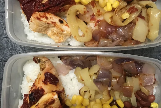 ШАГ 6 Выложить на сваренный рис нарезанную курицу в соусе, добавить 1 ложку фасоли, кукурузы и печеный лук с перцем.