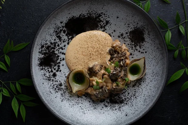 ШАГ 5 Выложить на тарелку рапан со сморчками, полить маслом из черемши. Рядом мусс из лимона и присыпать лимонной пудрой.