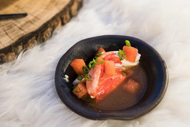 Краб с маринованным арбузом и соусом биск