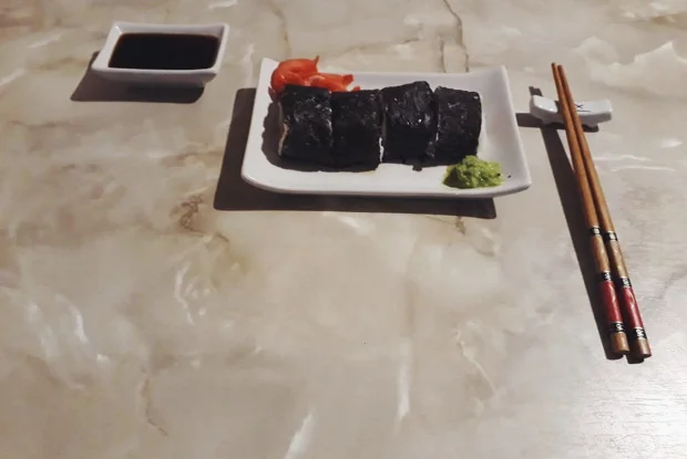 ШАГ 6 Рулет разрезать на роллы, готовое блюдо подать с соевым соусом, имбирем и васаби.