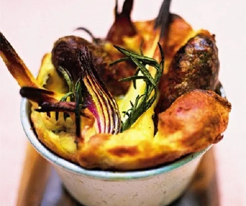 ШАГ 6 Как только масло начнет дымиться, разложить сосиски, пастернак и луковые полукольца по формочкам (или в 1 большую форму) и залить сверху тестом, чтобы оно заполнило формочки на 2/3.