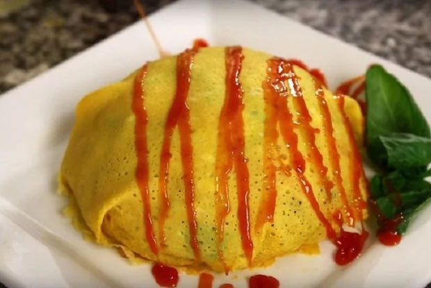 ШАГ 8 Положить в середину рис овощами, аккуратно лопаткой завернуть омлет, накрыв им начинку.