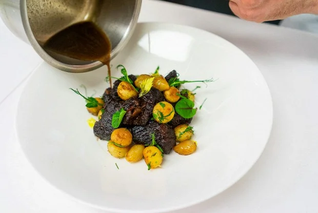ШАГ 12 Традиционно говядину по-бургундски подают с обжаренным картофелем с грибами и карамелизованным луком-шалотом. Обязательно полить мясо и гарнир соусом, оставшимся на дне кастрюли.