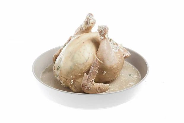 ШАГ 9 Спустя 40 минут достать курицу из кастрюли. Дать стечь бульону, после чего положить птицу в глубокое блюдо. Снять с курицы ткань и полить ее бульоном. Готовая курица не выглядит нарядной, но такова специфика рецепта. Главное, что она очень вкусная. Разделать курицу и тут же начать ее есть.